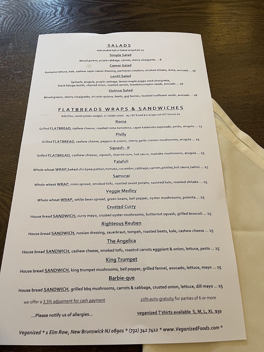 “ April 13 (Sunday) -- This restaurant is nestled among many more in a neighbourhood that gives a college-town vibe, and it's very close to New Brunswick railway station. The interiors have a `woody Victorian bar' feel. As a group of 4, we went here for dinner around 8pm and to our surprise several dishes were unavailable and we only came to know that a good 10-15 minutes after ordering. The service is slow, but friendly. We tried the following: 1. Morockin Grill : Mushrooms were well charred, but not burnt, nicely flavoured, but retained the taste of mushrooms, had crunchy/flaky ends, but soft stems---expertly made, in total! 2. Deluxe burger : Has some well-fried fillings, took a bite, it was good, nothing new/special. 3. Mash-n-gravy : Boiled mashed potatoes with some greens and carrots in a brown slightly-too-salty gravy. I couldn't make out what the gravy was made of, probably caramelized onions. On top of the mash, there was a fried square of tempeh, which was okayish. Overall, the dish is very heavy/filling. 4. Lentil salad : I didn't have much expectations for this one, but this turned out to be the best. The primary ingredient lentils and the additional tempe were cooked to give a very tender and soft bite. The tempe (in triangles) in particular was very tasty and impressive! Further, the dish had some seeds, avocado slices, cabbage slices, some leaves etc. which are usual for a salad I suppose 5. Chocolate Peanut Butter Torte : My friends appreciated it well for it's cream, coconut-y bottom, and rasberry coulis (which just tasted as some fruity jam to me). I couldn't enjoy it much, I probably had enough sugar for the day already. It costed ~$120 + tips, prices are slightly on the higher side. ”